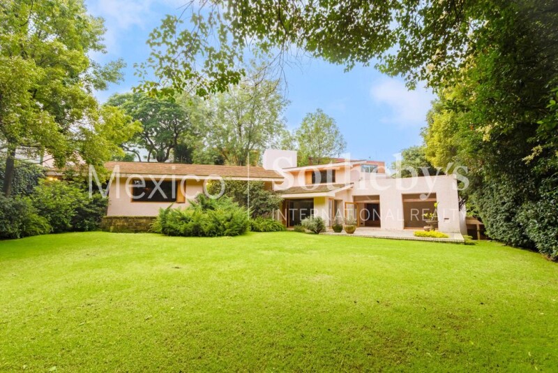 This property in Lomas de Chapultepec, situated on a 1,504 m2 lot, offers an excellent investment opportunity with the potential to be divided into two houses, according to the current urban development plan. With 823 m2 of construction and designed by architect Andrés Pons, the Barragán-style home stands out for its double-height ceilings, spacious areas, and the integration of natural and architectural elements that make it unique. The house can have two access points, through Montes Carpatos and Juan de Leyva streets, and features a semi-covered parking area with capacity for 7 cars. At the entrance, there is a foyer with a half bath, followed by a living room and dining room with garden views. The kitchen is spacious, fully white in design, with a large pantry and a breakfast area. Additionally, an office with garden views offers the possibility of converting into a fourth bedroom. The private area of the house, distributed across different levels, includes a family room and 3 bedrooms. The master bedroom has garden views, a private bathroom with a jacuzzi, a walk-in closet, and an emergency room. The other two bedrooms also have private bathrooms and walk-in closets, showcasing a spacious and comfortable design in each. The house is equipped with two gas heating systems, a cistern, a machine room, and a storage area, as well as a garden irrigation system. The service area includes a laundry room, two service rooms, a shared bathroom, and a small lounge. The location is unbeatable, surrounded by embassies (Japan, France, among others) and close to a C4 facility, ensuring a secure and exclusive environment. With its 28 years of age and distinctive architectural features, this property is ideal for those seeking luxury, security, and expansion options.