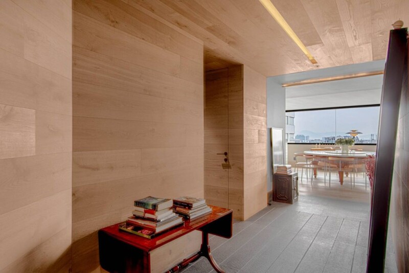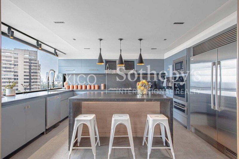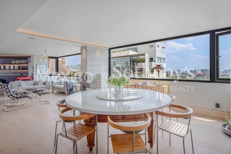 Spacious apartment with spectacular views of Polanco, in Section III 1 block from The Clock Park. Excellent apartment on level 12 in the heart of Polanco with all services. Completely remodeled with luxury finishes, 243 m2 habitable. 14-story building, one apartment per level. Direct elevator to the apartment. Entrance hall with fine finishes that leads us to the main living room, living-dining room, with spectacular views, it has 2 rooms 1 with built-in furniture and access to the good-sized outdoor terrace, where you can enjoy family meals or meetings with friends with a folding door to integrate it with the room. The other room next to the dining room has large windows along the entire length creating a pleasant atmosphere with natural light. The dining room with seating for 12 people attached to the functional kitchen has a central island of black marble in cascade with bar for three seats , angled black marble countertops, cupboards with storage capacity, it has double sink, dishwasher, wine refrigerator, 6-burner gas stove with oven, refrigerator and separate pantry, the kitchen has a beautiful wooden door and glass hidden in the wall to separate it from the dining room. It has a half bathroom for visitors. The hallway leads us to the three large bedrooms, the master with a large luxury dressing room and a bathroom with double sinks. The other 2 bedrooms have a walking closet each and a separate full marble bathroom. The service area has a bathroom and integrated laundry area that connects the service entrance with another elevator and the staircase. They are finished in travertine and black marble and acid-treated, wooden floors and walls, new aluminum windows throughout the apartment. Central heating, strategic lighting design designed. 2 parking lots. 24/7 surveillance.