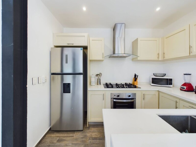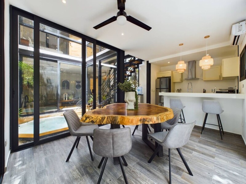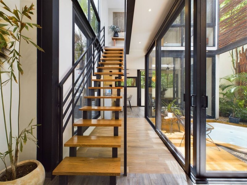 This architectural marvel seamlessly melds modern elegance with the natural beauty of the Mayan jungle, creating a luxurious retreat in a privileged location that brings you closer to the wonders of the Caribbean Sea. With its 247.9 m2 of meticulously designed construction, this 4 bedroom, 4.5 bathroom property epitomizes luxury and comfort in every detail. Situated just 3 km from Tulum’s beaches, this three-story home provides a generous and functional space for all aspects of contemporary living. Upon entering this dreamlike home, you will be welcomed by an entrance awash with natural light, enhancing the spaciousness of the interiors. Strategically placed windows at the heart of the property allow sunlight to grace every corner, seamlessly connecting with the surrounding nature. The layout of this residence is exceptional. On the second floor, you will discover three bedrooms, each with its own private bathroom, offering your guests and family utmost comfort and privacy. The third floor hosts the fourth bedroom, also with its private bathroom, and offers additional space for the convenience of a washer and dryer. From here, direct access to the rooftop awaits, where you will find a charming living area and a private pool, crafting a personal oasis in the heart of the jungle. The communal areas of this residence extend the luxury and comfort. Here, you can relish in a spacious pool with sun loungers to bask under the sun, an exhilarating climbing wall to push your boundaries, a spiral walkway guiding you to the rooftop, where a dedicated space for yoga, a fully equipped gym, a terrace for socializing, and a billiards table await. This luxury refuge resides within a private complex amidst the jungle, offering 24/7 security for your peace of mind. Additionally, private parking adds convenience to your experience. In this villa, luxury, comfort, and a profound connection with nature converge in an unparalleled manner.