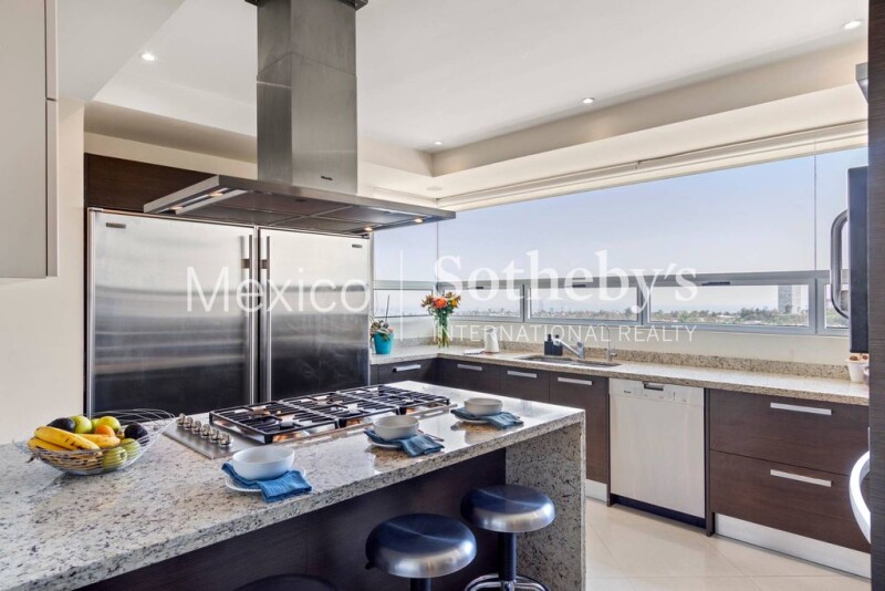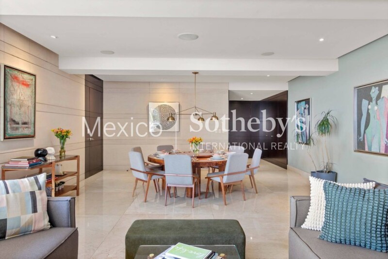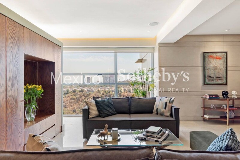 Veramonte is a residential located in La Loma, Santa Fe. Santa Fe is a modern and upscale district located in the western part of Mexico City, known for its high-rise buildings, shopping centers, and corporate offices. This apartment is located on the seventh floor of a modern residential building and features a spacious living area. The living room is brightly lit with large windows and has enough space for a comfortable sofa, a coffee table, and a TV stand. The kitchen is fully equipped with modern appliances Miele and Sub-Zero such as a fridge, oven, stove, and dishwasher, and has a lot of storage space for groceries and utensils. The building has 24/7 security, and residents can access a communal rooftop with magnificent views of the city. In order for the residents of Veramonte to have direct access to spaces that enrich contemporary life, they have multiple amenities that exceed all expectations; cafeteria, meeting room, cinema, events room, playroom, gym, spa, teenage lounge, game room, adult room, paddle tennis courts, indoor and outdoor pool with spa to relax. Overall, this 3-room apartment in Veramonte provides a comfortable and convenient space for a family, with easy access to shops, restaurants, and public transportation in the surrounding area.
