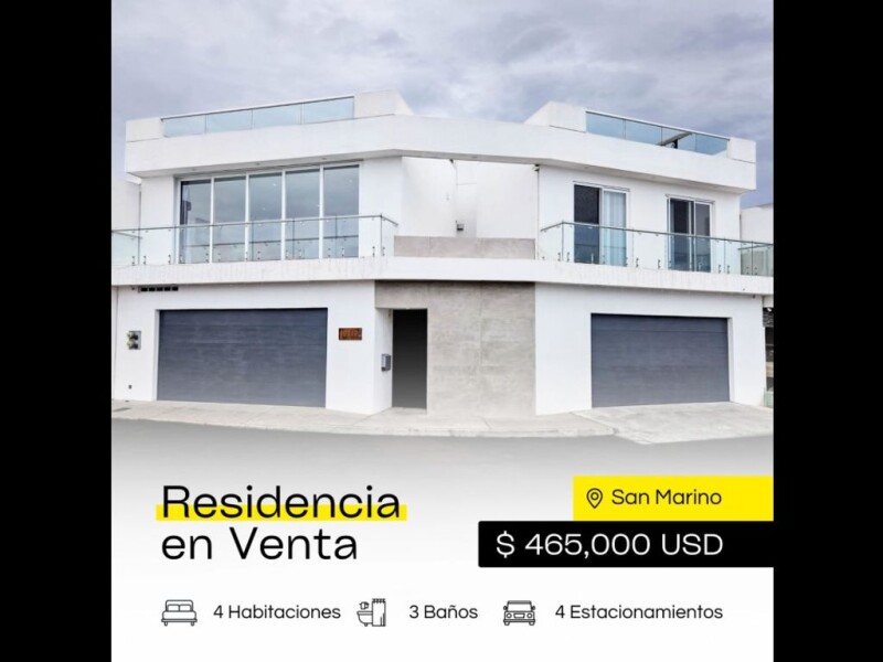 22567 San Marino, BC, Mexico Features: - 4 bedrooms - 3 bathrooms - 4 parking spaces - 347 sq. mts. of construction - 226 sq. mts. of land 3 BEDROOM HOUSE WITH 1 BEDROOM APARTMENT FOR SALE IN SAN MARINO TIJUANA This beautiful property with a unique design in its kind, offers spacious, bright and cozy spaces ideal to enjoy with family and friends. It also offers a separate 1 bedroom apartment that you can take advantage of for your guests or rent it for short periods of time and get excellent monthly economic benefits. Its price is $465,000.00 Dollars and all credits and cash payments are accepted. Located in one of the most beautiful subdivisions of the coastal area, it offers a proximity to the sea with spectacular views, just 5 minutes from Rosarito and 5 minutes from Tijuana beach, its location makes it ideal for living surrounded by everything you need for you and your family. Built on a 226.58 m2 lot, its contemporary architecture of three levels, completely of concrete, yields 347 m2 of construction. With the following distribution. On the first level: We find two spacious garages with space for two cars each, as well as the foyer of the house with a study area under the stairs, immediately we find the master bedroom, with access to the backyard with landscaping and a water fountain in the shape of a Buddha's head. The bedroom has a large walk-in closet. As well as a full bathroom with cancelleria, granite sink, a floating wooden cabinet and large mirrors as well as a bidet for your hygiene. Second level: There is the social area of Dining and Living room with excellent view and natural lighting thanks to its beautiful balcony with retractable windows on both sides, consecutively the integral kitchen with its beautiful granite sink, backsplash tiles and a spacious pantry independent to the integral kitchen. Let's not forget the two large secondary bedrooms fully furnished, with custom closets and ceilings in high quality wood and sharing a large bathroom with fine finishes and cancellation. The independent guest apartment has 1 bedroom, full bathroom, fully equipped kitchen with high quality appliances and a balcony surrounding the living room and master bedroom. Third level: The most fun social area, two spacious rooftop terraces, leveled for drainage and finished with water outlets and gas connections for outdoor cooking, offers gas fire pit, planters with own drainage and water system, with open glass walls in front with railings for safety. Accessories and additions: - The entire property has 4k security camera system. - Closed workshop with its own subpanel with two 220v outlets. - Cistern and automatic water pump. Water filtration system that filters and kills with an ultraviolet light. - The property has additional furniture and accessories that can be negotiated at the time of the offer if you feel like it. - Each of the properties has its own meter and 2 electric sub panels with a total of 200 amps available, plus 2 boilers one for each property. If you want to know it schedule an appointment without obligation and do not miss the opportunity to invest in your future and in the inheritance of your family. Exterior Features - Cistern - Covered parking - In front of the beach - Garage - Garden - Grill - Patio - Terrace - Ocean view General Features - Air conditioned - Kitchen Recreation Features - Fireplace IMPORTANT The images shown may vary from those of the original product. Published prices are subject to change without notice. The form of payment can be by credit (bank/Infonavit) or own resources. The property is with documentation in order Published price does not include deed expenses Intermediation Contract of Adhesion for the purchase and sale of real estate, registered in the PROFECO, Number 4149-2022 dated August 30, 2022. We invite you to see our privacy notice located on our website. I'll take you to meet her, I look forward to your call!.