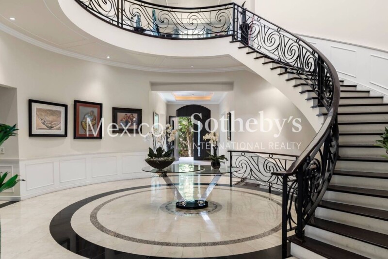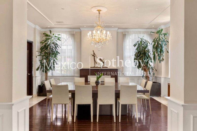 In the heart of Pedregal, on a street with double surveillance and within an exclusive gated community of only 5 houses, is this spectacular English-style residence, by Architect Carlos Castro Paredes. Upon entering you are greeted by an Imposing brick façade and a beautiful front garden with a terrace ideal for outdoor meals and meetings. Majestic trees provide absolute tranquility, impressive white stone stairs lead to the main entrance framed by palm trees of more than 10 meters. The interior has a Hall with marble floors and a spiral staircase that becomes the central part and masterpiece of the house; around it are arranged a large dining room, living room with billiards area and grand piano, large dining room and kitchen equipped with high-end appliances; It has a quartz island, ideal for cooking or eating right there. In the pantry, built-in coffee maker and wine refrigerator. The windows offer green views. On the upper floor, there are three spacious bedrooms, each with a walk-in closet and bathroom, the main one with a large dressing room. In addition, a study and TV room; The house has a functional Kone elevator for 10 people. In the basement, an office, cellars, a games room with a wet bar, and a bathroom with access to the magnificent terrace and garden. 6 covered parking spaces and utility room.