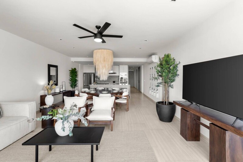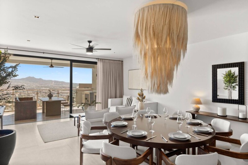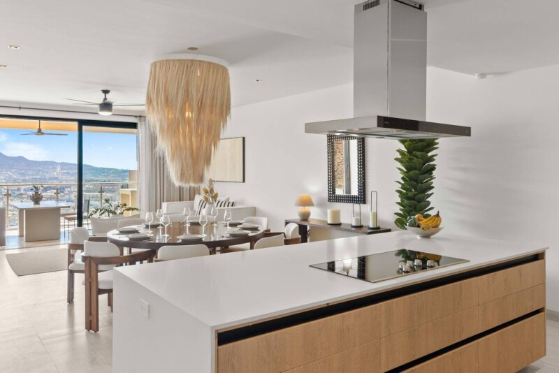 Experience luxurious coastal living in this spacious condo featuring 3 bedrooms and 3.5 bathrooms. Bathed in natural light, the stylish interior features modern decor and light colors, with elegant quartz countertops in the kitchen. Eco-friendly features include solar panels for common areas, a recycling program, and trash chutes with garbage separators on each floor. Advanced filtration systems ensure drinkable water and A/C filters provide cleaner air throughout the residences. Enjoy amazing ocean views and a range of on-site amenities, including a heated swimming pool, jacuzzi, sauna, steam room, fire pits, and a bar. Stay active with access to tennis courts, basketball courts, a gym, and pickleball. Relax in the massage room or unwind in the clubhouse. This gated community offers beach access to a pristine sandy beach, a deli, and a farmers market. Benefit from up to a 20% discount at local restaurants and the convenience of short-term financing. Families will appreciate the international bilingual K-12 school and the community's desalination plant. Experience this exceptional condo development's ultimate blend of comfort, luxury, and sustainability.