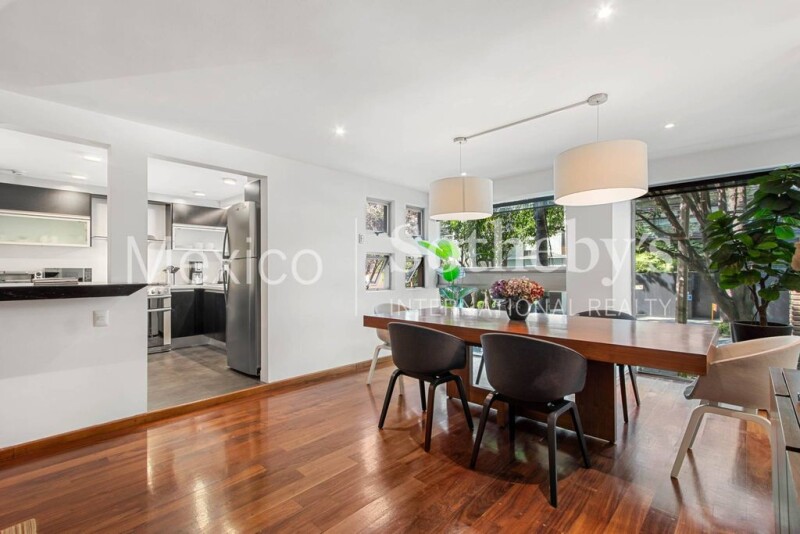 Beautiful exterior apartment in the heart of Polanco on Tennyson Street between Homero and Horacio. Exclusive building of only 7 luxury apartments is located on the first level with tree-lined views on quiet street. Apartment of 300 m2 living room living room with practical open kitchen, equipped and with dishwasher, double sink, marble countertops, washing area island bar with benches. 2 spacious bedrooms that can be converted into 3 bedrooms and 3 full bathrooms. The first bedroom has a full bathroom and a double bedroom and large closet. The second full bathroom, the third suite room that can be divided into 2 independent bedrooms with a large bathroom with double sink and access to the semi-covered terrace with Jacuzzi, dining area and outdoor living room creating a pleasant totally private outdoor environment. It has fine finishes, salam wood floors, tile and marble bathrooms, LED light system throughout the apartment, combination veneer, 24-hour security. Elevator, 2 convenient parking spaces, store 24-hour surveillance. It can be sold with separate furniture.