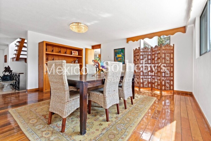 A modern outlook of California Architecture and Mission Style, this property has incredible space and plenty of natural light. Recently remodeled 2019 by Architect Maximiliano Aréchiga disciple of Architect Pedro Ramírez Vazquez, creating a clean minimalist and airy areas. The property has great views of Bosques de las Lomas and has access and permits to an adjacent park where the kids playground can be designed for enjoyment. Multiple rooms for family relaxation such as a complete finished basement and also a family room on the third floor. The terrace has amazing dimensions for gathering and celebrations where family can play basketball as well as a Volleyball game in the green garden. The lighting comes from incredible large windows and skylights that give this warm feeling of family life and even though the construction square footage is large is a very cozy space, waiting for you and your family to make it your own. Terrace, fireplace, finished Basement, Home Office.