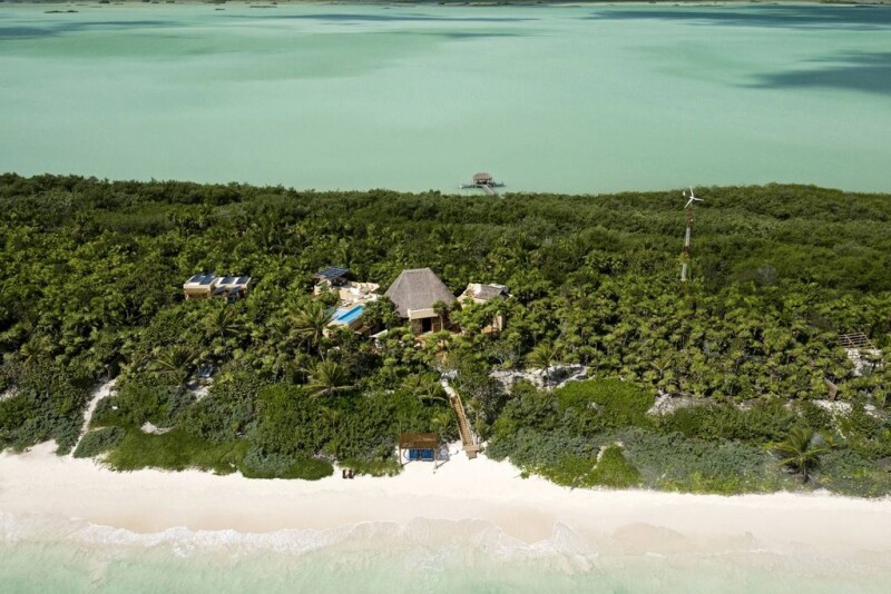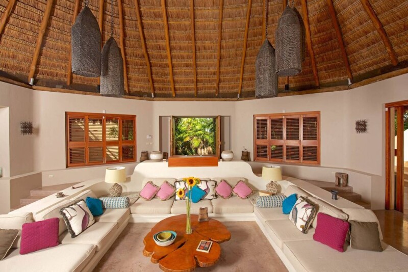 This majestic Villa is located in the Biosphere of Sian Ka’an, the main ecological reserve at the Riviera Maya. The zone is characterized for its flora and fauna diversity, which are protected, and this is the reason why restrictions regarding environment impact and density are very strict. Only single family homes are allowed every 86 meters of beachfront. Constructions in the area are self-sustaining and eco-friendly. It is located just a few minutes from Tulum, and it has access to virgin beaches of white sand and turquoise waters on one side, and on the other the lagoon. Just by the shore of Sian Ka’an there is the second biggest barrier reef in the world, and around the area it is possible to enjoy of natural sink holes of crystalline water (cenotes). You will have access to the quietness and peaceful environment that offers the fact of being immerse in the nature. Located only 7 kilometers into the Sianka’an Reserve, the Villa is easily accesible but at the same time extremely secluded and private. The house is well integrated with the enviroment, invisible to passerby, and protected by a deep dune and well cultivated flora and fauna. The romantic and magical nature of the house and surroundings, and the attention to details in all areas, contribute to making the entire villa a treasure in itself. The broad outside decks, spectacular views, rooftop pool, endless beach, multiple areas for relaxing indoor, all contribute to making the villa a true oasis. The grand palapa living room overlooking the azure sea without doubt is the heart of the house. One can experience spectacular sunrises from the large front deck and majestic sunsets from the private dock facing the lagoon and rooftop. The integrated architecture and tasteful interior design of the Villa, make it a unique offering in Sianka’an and indeed in the Riviera Maya. The house and the surroundings were designed to maximize the enjoyment and experience of being in a Biosphere Reserve, but at the same time providing ultimate luxury and comfort in a private tropical beachfront paradise. The Villa was built on a 56,381 square feet lot, and it has 3,972 square feet of construction. It was designed by architect Jokin Donnay and Kince Arquitectura, and interior design by Susan Jaimeson of Bridget Beari Designs in collaboration with the owners. Great consideration was given to integrating the design into the surrounding with extreme attention to detail. Additionally, the villa has a state of the art “off the grid” energy system and draws almost all of its energy from the wind and sun. The Villa was completed in 2011. A separate adjacent casita houses a chef’s kitchen, a staff apartment, and two additional bedrooms was added in 2014. We consider the villa a work of art and there are many aspects of the house and its location that we are surely omitting .
