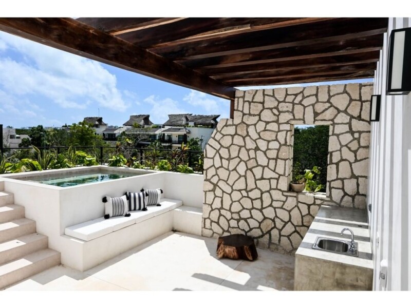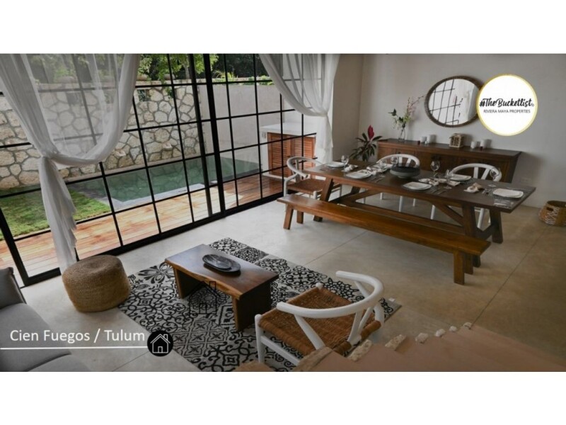 Ready for immediate delivery, Cienfuegos is an exclusive luxury development with a surface area of 1170 m2 and only 8 town houses, each with two private pools and deeded parking. With an elegant and vibrant Mediterranean feel, Cien Fuegos is located in an unbeatable corner location on one of the main streets of Aldea Zamá. Each house has integrated solar panels at no additional cost. Seeking to reduce consumption costs by up to 97% by taking advantage of solar energy. FEATURES Reception Garden with pool Roofdeck with pergola Pool Grill Private parking Lock off suite with roof 2 private pools Large spaces Prices may change without notice.