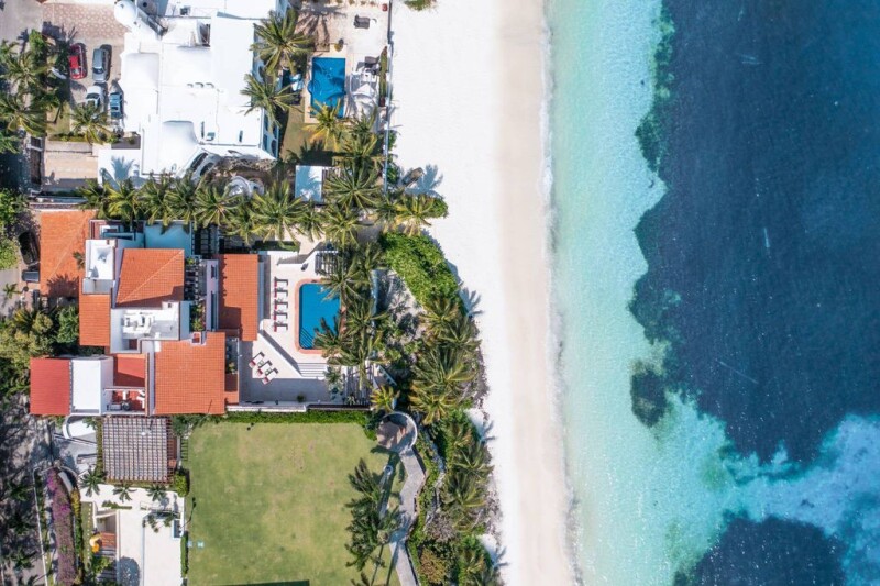 Exclusivity, privacy, luxury, elegance, classic architecture, one of the best beaches in the Caribbean Sea; are some of the characteristics that make this Villa one of the best beachfront properties, in the heart of the hotel zone of Cancun. This Villa is located within a private complex of only 13 exclusive villas located in front of the incomparable Caribbean Sea. The Villa is located in front of the best beach in the hotel zone of Cancun, talc white sand and the impressive colors of the Caribbean Sea, on a land of 994 m2 (10699.3 Sq.Ft.) and 857.60 m2 (9231 Sq.Ft.) of construction. Luxurious and spacious spaces, large windows and terraces with direct views of the Caribbean Sea, luxury finishes and impressive chandeliers. The property has the main house with 5 rooms, a one-bedroom studio and another apartment of two stories with two rooms that are connected to each other, a total of 8 bedrooms in the Villa. Space for 6 cars. On the ground floor it offers a spacious hall, half guest bathroom, wide and open spaces, with luxury finishes; a double-height social area with an impressive chandelier and large windows, thus favoring spectacular views and natural lighting; also a spacious dining room that connects with a second room. The spacious kitchen with rustic finishes that has a large bar, high-quality appliances and a service area. Also a 1-bedroom studio with dressing room and full bathroom, it also has a kitchenette, dining room and living room. Outside, two large covered terraces that house excellent spaces for socializing, a living room and a bar area; as well as a dining room for 12 people with direct views of the Caribbean Sea; different areas for lounge chairs and an impressive pool facing the sea, finally an area of extraordinary vegetation, with direct views of the Caribbean Sea. It also has 2 more bedrooms, on a half level down, they are bedrooms that are connected to each other and each have a full bathroom and walk-in closet, a bar, with views and direct access to the Caribbean Sea. On a second level are the luxurious secondary bedrooms, with a dressing room, full bathroom, and terraces with ocean views, as well as impressive chandeliers. On the third level is the impressive master bedroom, spacious, with windows that open onto a terrace with direct views of the Caribbean Sea, it has a large dressing room with views of the lagoon and a large bathroom with double sink, with tub and shower with windows to have direct views towards the sea. The main house is connected from the inside or outside with an apartment, both with independent access from the street. The apartment is on two levels, on the ground floor it has a living-dining room, kitchen, a complete bathroom, two dressing rooms and a large bedroom with a direct view of the sea. On the second level there is a spacious bedroom with an extraordinary terrace with a direct view of the golf course and the lagoon.