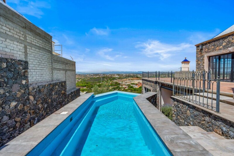 Golden Homes is honored to present Bella Vista, a spectacular new 4 bed / 4.5 bath home featuring large gardens, an infinity pool, and dramatic views of Centro skylines and western mountains from multiple levels. Located just 5 minutes drive from Centro in the exclusive community of La Bella, the property is an exemplar of the Mexican contemporary style with hand-hewn stone walls, wood beamed ceilings, and enormous plate glass windows that bathe the spacious and comfortable interiors in a soft natural light. The considerable 751m2 lot sits directly above the Parque Zefferino and the new commercial development of Pueblo Bonito in an area that is poised to become on of San Miguel’s most desirable, oferring quick access to Centro, Las Ventanas Golf Course and the “Golden Corridor” of wineries, ranches and hotsprings found along the newly constructed highway to Dolores Hidalgo. Priced to sell at $600,000 usd Casa La Bella is truly a must-see – a dramatic and spacious property that simply must be experienced.