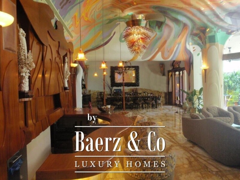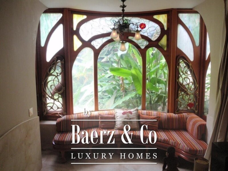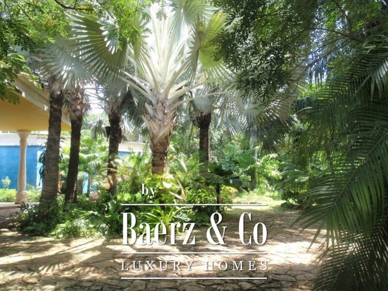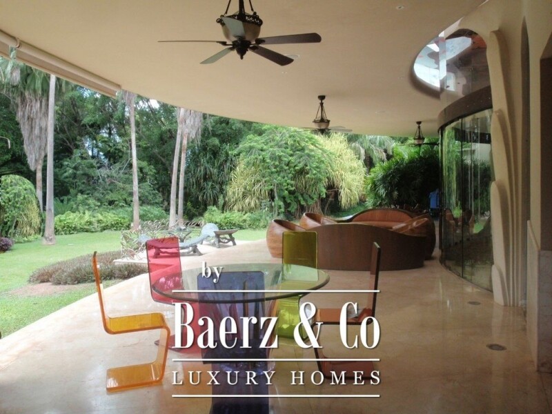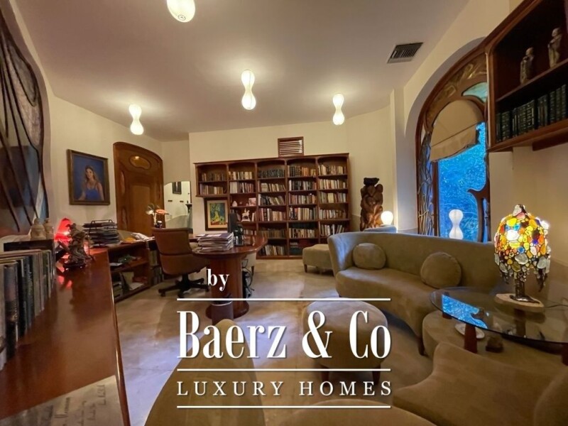 Set in the exclusive neighbourhood of San Benito Norte and surrounded by private gardens and leafy trees, the home sits in complete privacy in an enclave behind security gates. Five teams of carpenters worked on the house, principal among them was Don Andrés Velásquez, who set up his workshop for 5 years. He hand carved all the doors and windows of the house, as well as the furniture of both studies. The muralist Saúl Villa worked for four month painting the ceiling and wall of the main hall based on a photograph of a sunset in the beach town Celestún. The ceiling of the main room, the columns in this room as well as the hallway and ceiling towards the oratory were works of the sculptor Rosendo López. He also created the window protectors in the bedroom area as well as flying buttress lamps on the outside of the house, all in bronze. Several teams of engineers, blacksmiths and master masons worked with the owners to achieve unique pieces that are seen throughout the house. Amenities include: Spacious living areas noth formal and informal. 2 studios/offices. 4 bedrooms, 4 and ½ bathrooms. 4 dressing closet. Covered terrace 110 m2. Kitchen-breakfast room with large pantry. Oratory with stained glass. Large white closet. Utility room with full bathroom. Guardhouse with full bathroom. Marble floors and large baseboards. Bathrooms with marble and Bisazza mosaics. Windows with MR-10 anticyclonic tempered glass windows 9mm. All doors and windows of hand cut solid cedar • Swimming pool with its dressing room. • Home air conditioned throughout with 10 minisplit units.