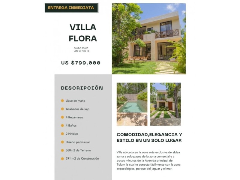 Discover paradise at Casa Flora, located in the exclusive Aldea Zama, Tulum! Invest in this wonderful property with immediate delivery, fully furnished and ready for you to start living your dreams. Casa Flora has: - 4 spacious and comfortable bedrooms - Private pool to cool off at any time - A beautiful garden to enjoy nature - Spectacular terrace to relax and admire the views Don't miss the opportunity to live in one of the most desired destinations in the world. Your new home awaits you in Tulum!.