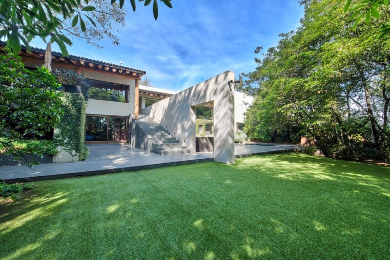 Designed by the renowned architects Ricardo Legorreta and Alejandro Bernardi, this majestic residence is an architectural masterpiece that uniquely combines functionality and design. With spacious areas that invite an exceptional lifestyle, this house is a true haven of luxury and comfort. Located in the exclusive Bosques de las Lomas area, within a private community with controlled access that ensures security and privacy, this residence sits on a 1,965 m² plot with 900 m² of construction. The house welcomes us with an impressive entrance that includes an outdoor living room with a rustic stone fountain, and in the background, the main door opens to a double-height foyer. The beautiful main living room, featuring an elegant bar, leads to the large terrace equipped with a table, bar, and a view of a lovely garden. From there, you access another terrace with a water mirror and a large jacuzzi, creating a luxurious environment to experience nature in its fullest expression. The dining room, a true spectacle of harmony with a design that encourages socializing, is complemented by an exceptional wine cellar, suitable for the most discerning lovers of fine living. The spacious, bright kitchen, fully equipped and practically connected to the service areas, is not only beautiful but also functional. On the upper level, there is a spectacular family room offering panoramic views, featuring a stylish wall adorned with multiple televisions, leading to the master bedroom with dual bathrooms and luxury walk-in closets. On the lower level, the property features a private office, three additional bedrooms with walk-in closets and stunning views. It also includes a gym with direct access to an interior terrace, perfect for relaxation. The combination of heights, materials, and textures, along with the lighting and the views provided by both the interior and exterior terraces, make this place truly unique and a true architectural gem.
